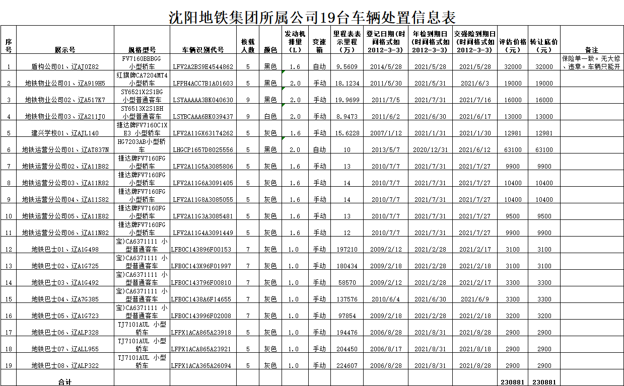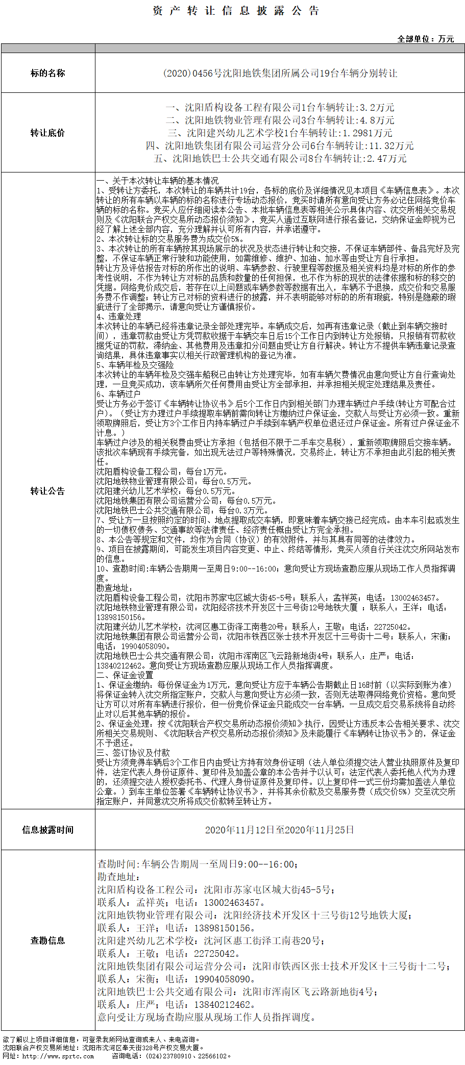 (2020)0456號(hào)沈陽地鐵集團(tuán)所屬公司19臺(tái)車輛分別轉(zhuǎn)讓