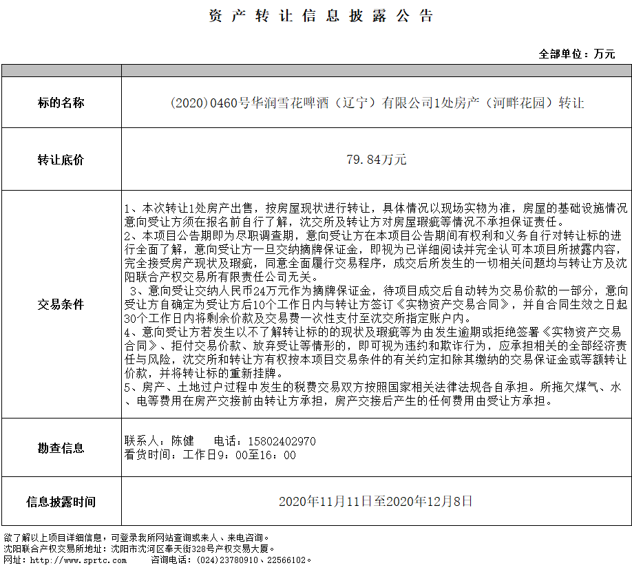 華潤雪花啤酒(遼寧)有限公司1處房產轉讓 (河畔花園)