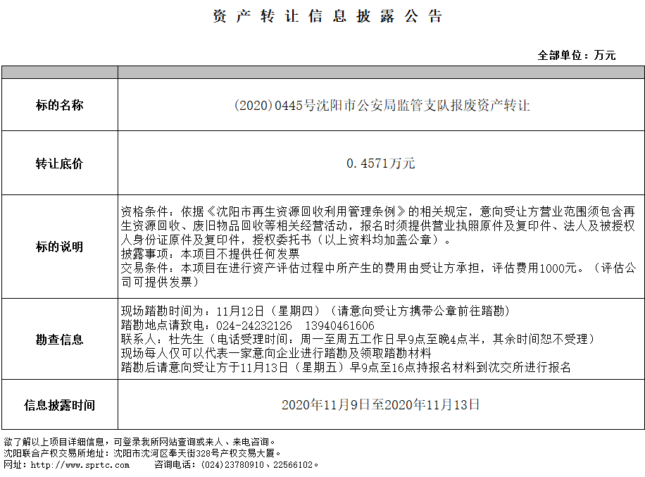 沈陽市公安局監(jiān)管支隊(duì)報(bào)廢資產(chǎn)轉(zhuǎn)讓