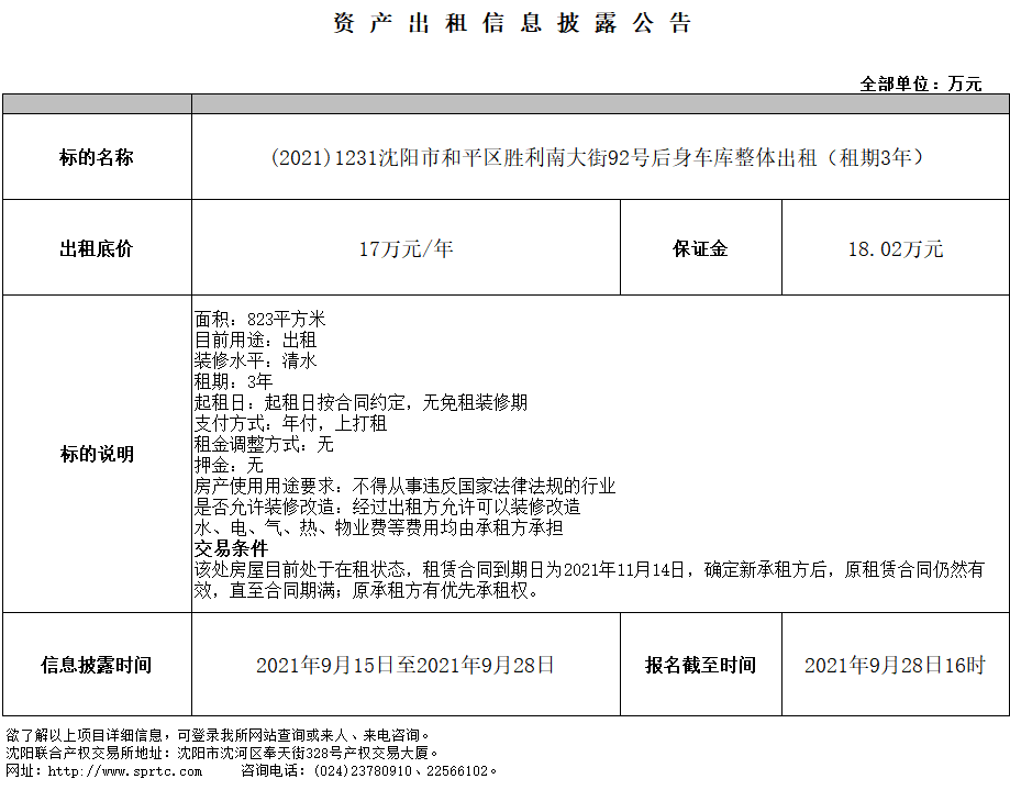 沈陽市和平區(qū)勝利南大街92號后身車庫整體出租(租期3年)