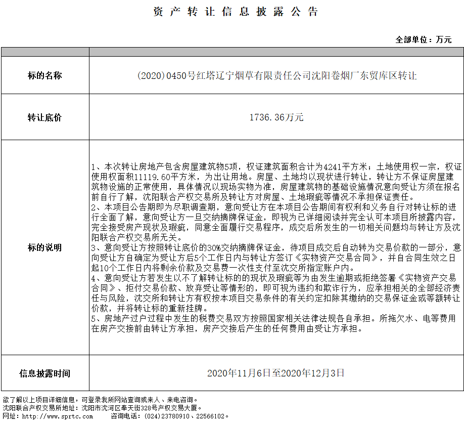紅塔遼寧煙草有限責(zé)任公司沈陽卷煙廠東貿(mào)庫區(qū)轉(zhuǎn)讓