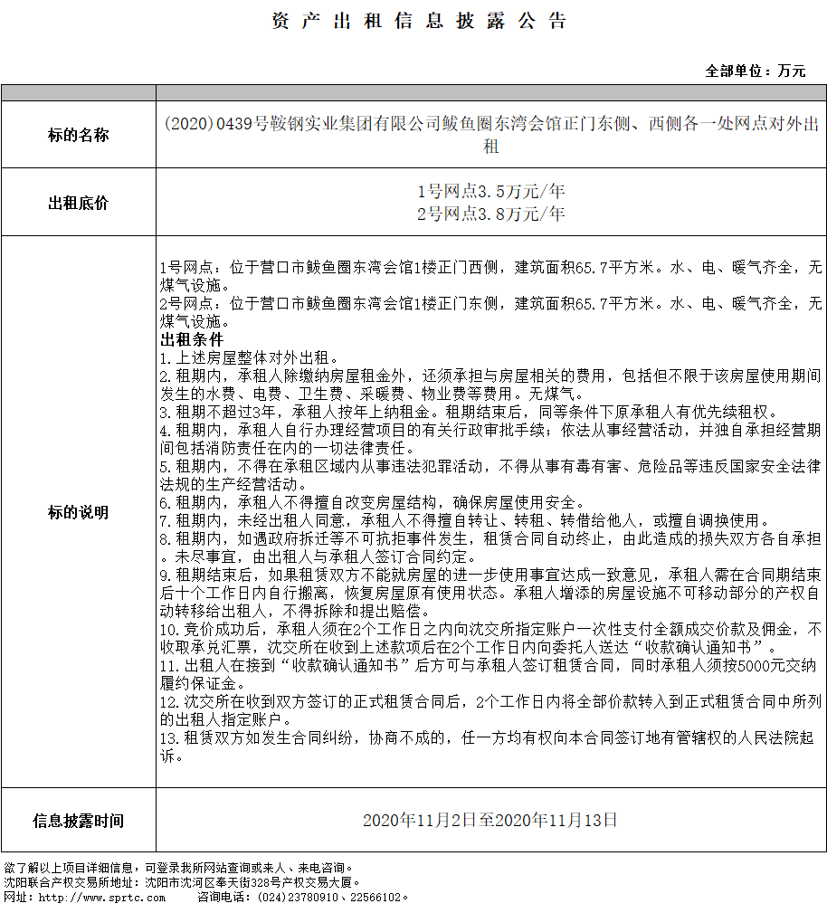 鞍鋼實(shí)業(yè)集團(tuán)有限公司鲅魚圈東灣會(huì)館正門西側(cè)一處網(wǎng)點(diǎn)對(duì)外出租