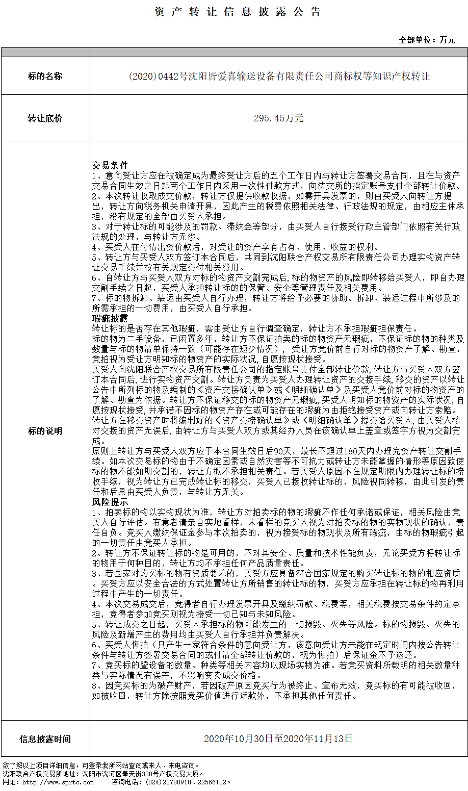 沈陽(yáng)皆愛(ài)喜輸送設(shè)備有限責(zé)任公司商標(biāo)權(quán)等知識(shí)產(chǎn)權(quán)轉(zhuǎn)讓(第八次)