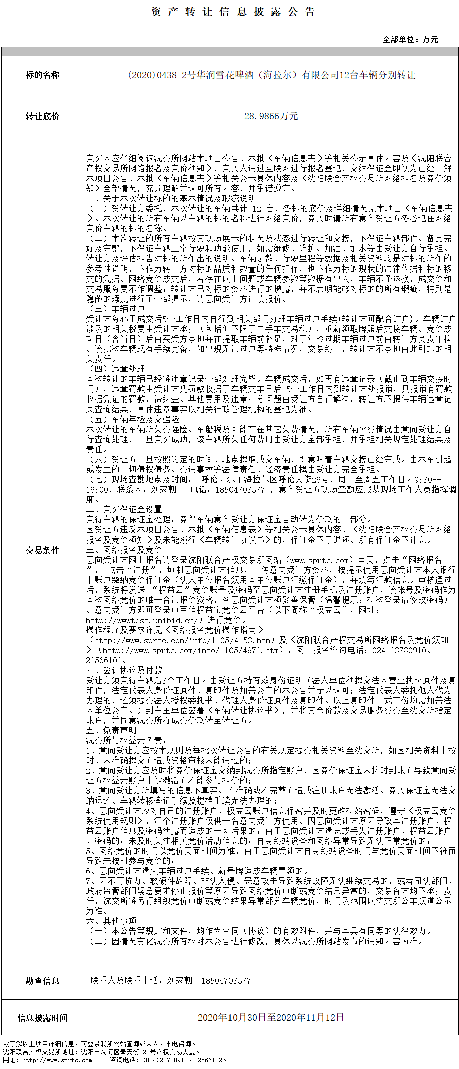 華潤雪花啤酒(海拉爾)有限公司12臺車輛轉(zhuǎn)讓