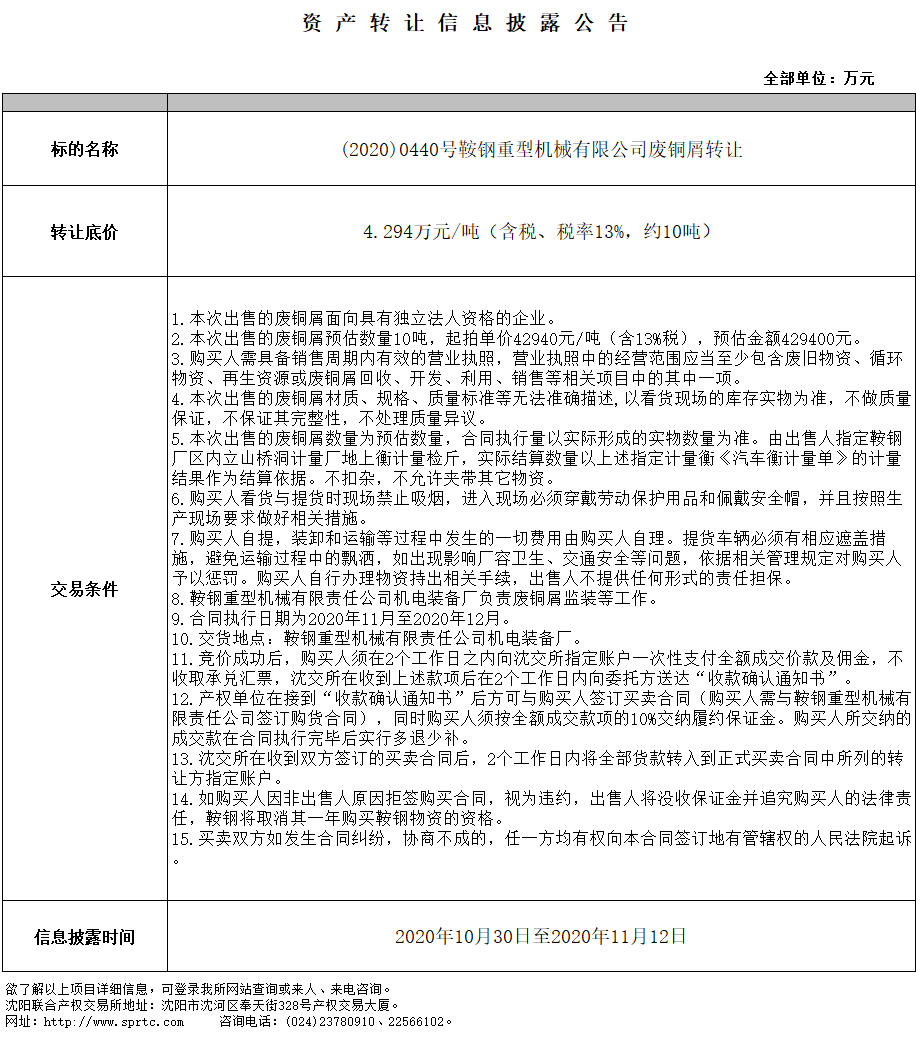 鞍鋼重型機(jī)械有限責(zé)任公司廢銅屑轉(zhuǎn)讓