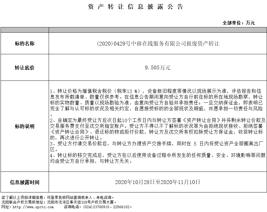 中移在線服務有限公司報廢資產轉讓
