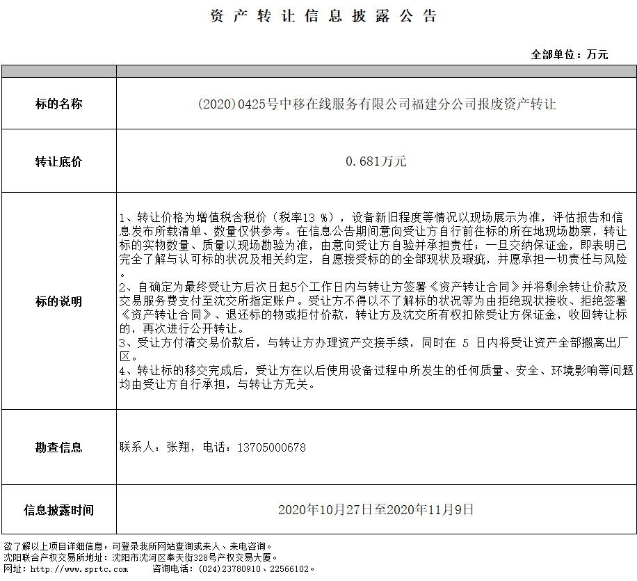 中移在線服務(wù)有限公司福建分公司報(bào)廢資產(chǎn)轉(zhuǎn)讓