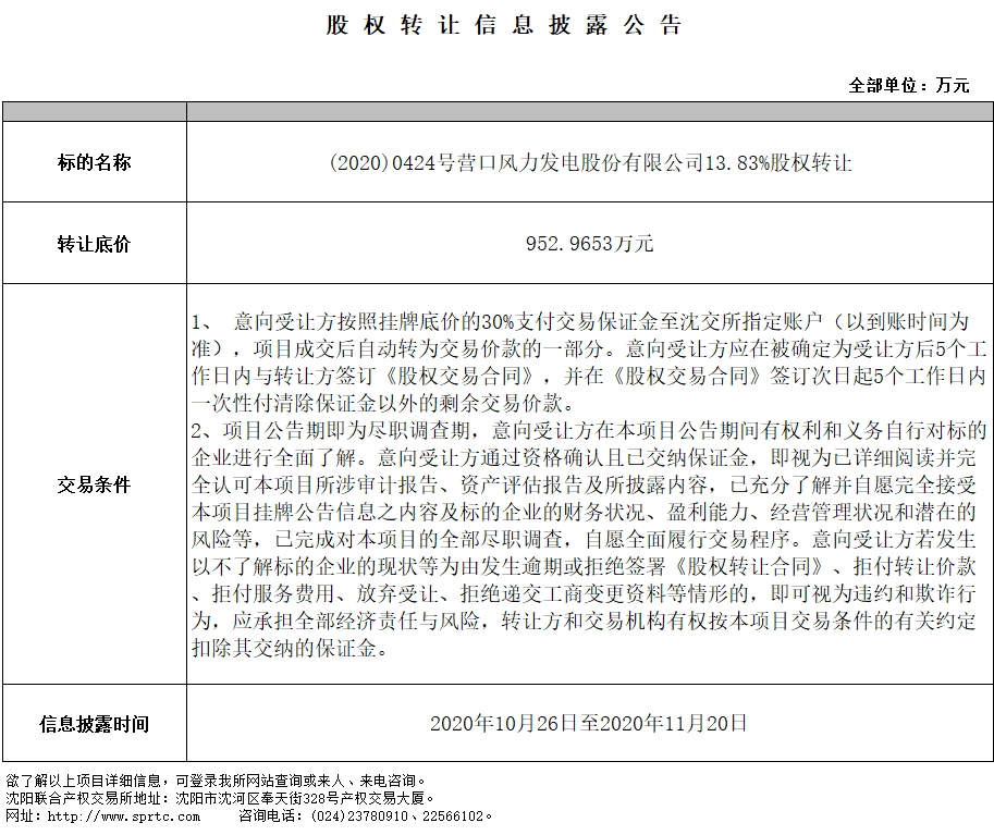 營口風(fēng)力發(fā)電股份有限公司13.83%股權(quán)轉(zhuǎn)讓