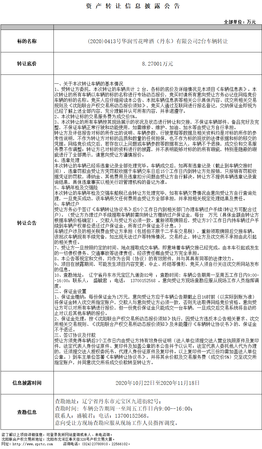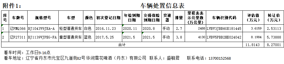 (2020)0413號(hào)華潤(rùn)雪花啤酒(丹東)有限公司2臺(tái)車輛轉(zhuǎn)讓