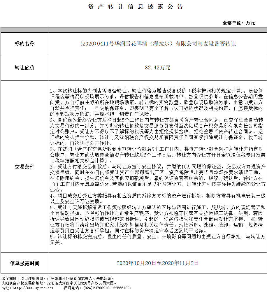 華潤(rùn)雪花啤酒(海拉爾)有限公司制麥設(shè)備等轉(zhuǎn)讓