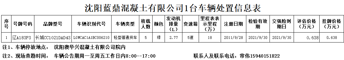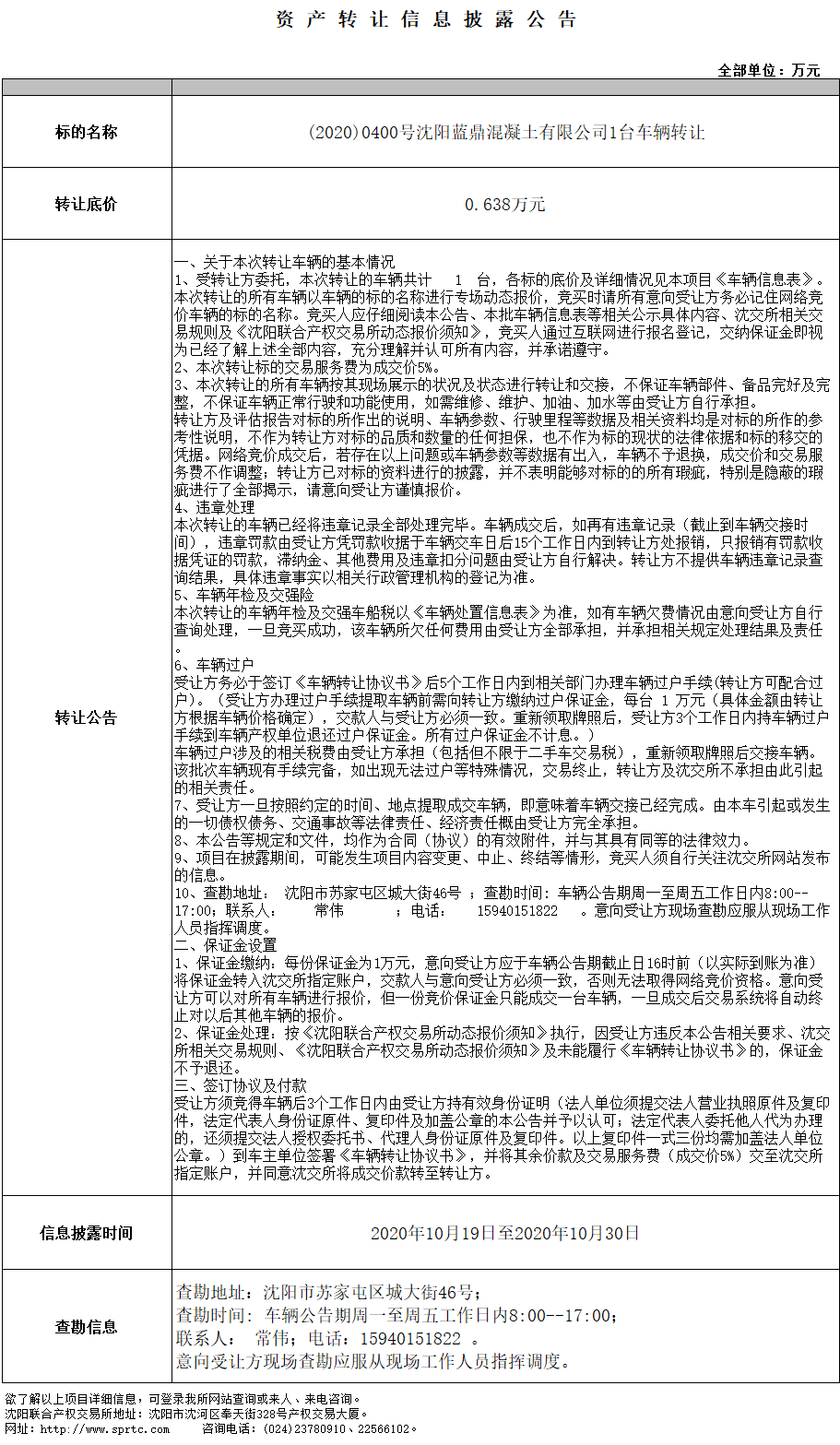(2020)0400號(hào)沈陽(yáng)藍(lán)鼎混凝土有限公司1臺(tái)車輛轉(zhuǎn)讓