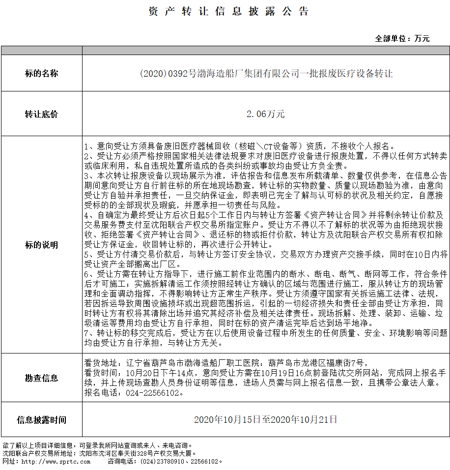 渤海造船廠集團(tuán)有限公司一批報(bào)廢醫(yī)療設(shè)備轉(zhuǎn)讓