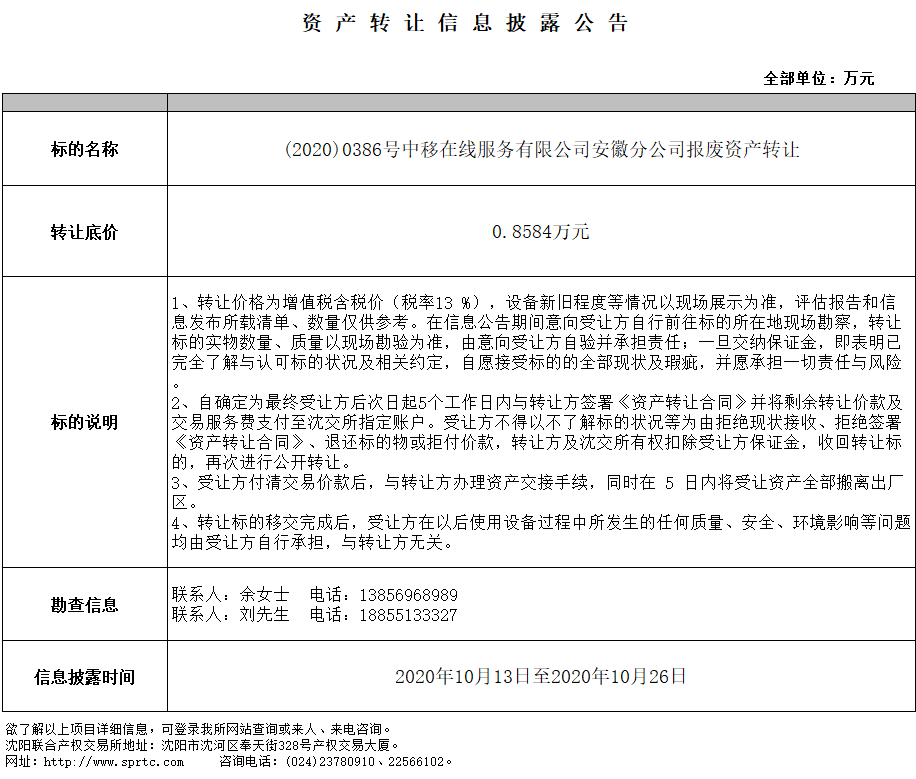 中移在線服務(wù)有限公司安徽分公司報廢資產(chǎn)轉(zhuǎn)讓