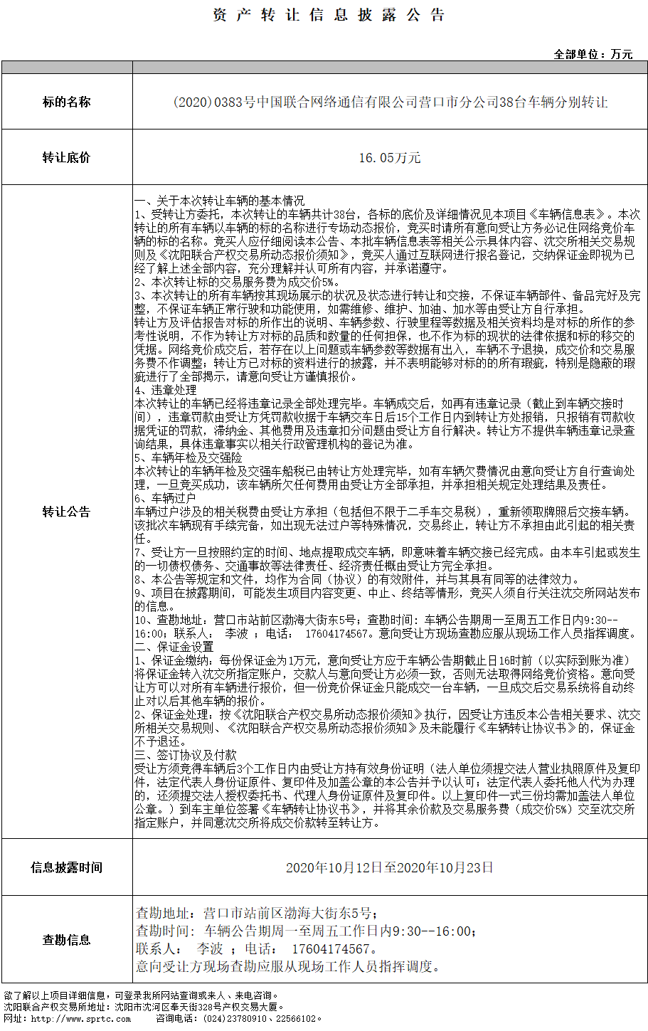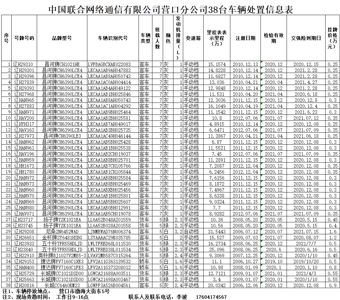 (2020)0383號(hào)中國(guó)聯(lián)合網(wǎng)絡(luò)通信有限公司營(yíng)口市分公司38臺(tái)車輛分別轉(zhuǎn)讓