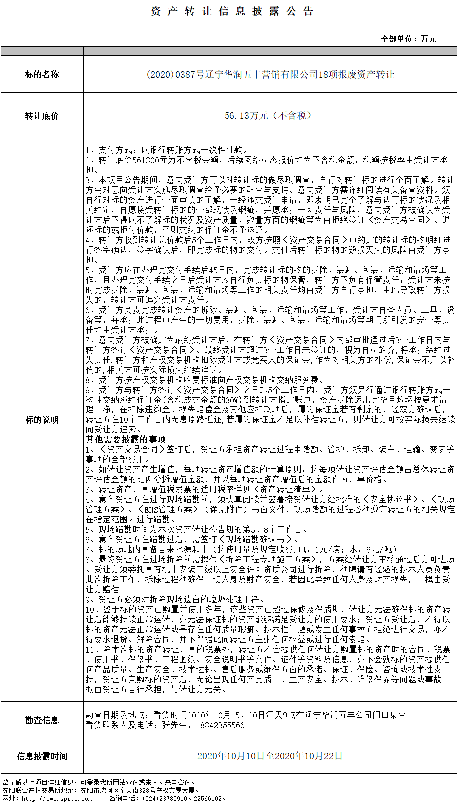 遼寧華潤五豐營銷有限公司18項 報廢資產(chǎn)轉(zhuǎn)讓