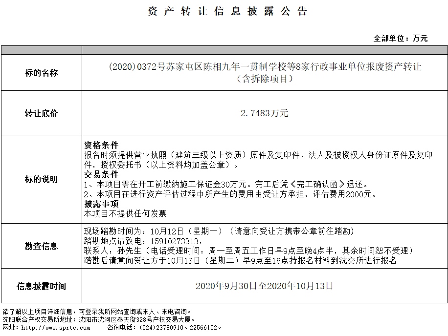 蘇家屯區(qū)陳相九年一貫制學(xué)校等8家行政事業(yè)單位報(bào)廢資產(chǎn)轉(zhuǎn)讓(含拆除項(xiàng)目)