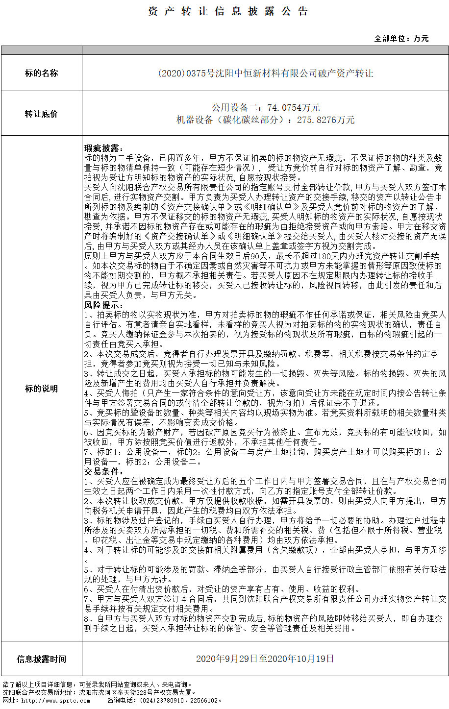 沈陽中恒新材料有限公司二手設(shè)備包機器設(shè)備 (碳化碳絲部分)第六次掛牌