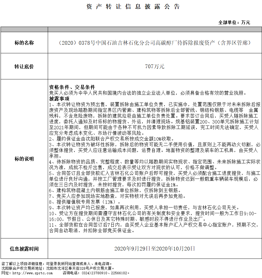 中國石油吉林石化分公司高碳醇廠待拆除報(bào)廢資產(chǎn)(含界區(qū)管廊)