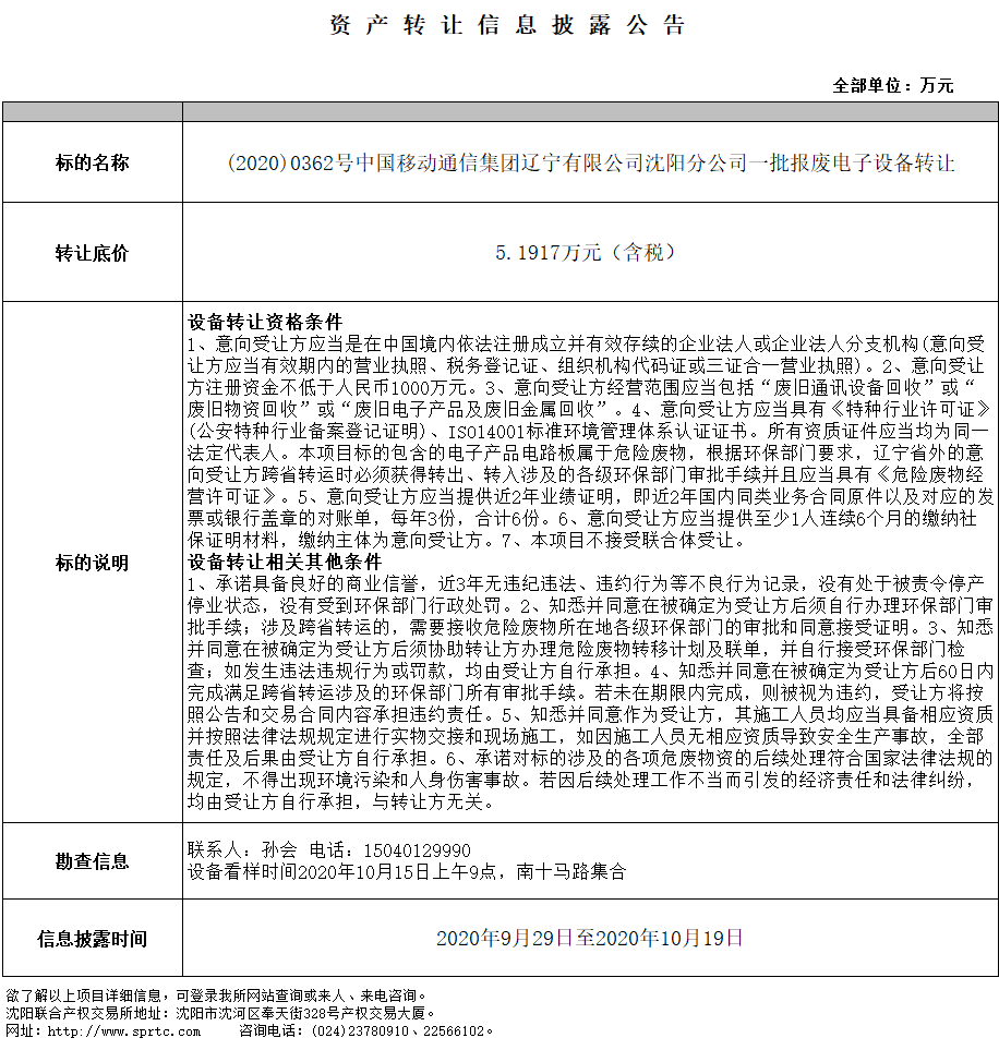 中國(guó)移動(dòng)通信集團(tuán)遼寧有限公司沈陽(yáng)分公司一批報(bào)廢電子設(shè)備轉(zhuǎn)讓