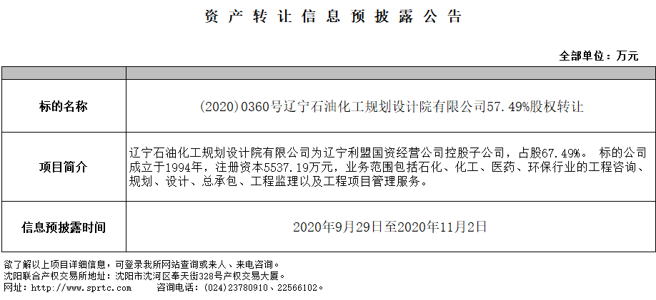 遼寧省石油化工規(guī)劃設(shè)計(jì)院有限公司57.49%股權(quán)轉(zhuǎn)讓信息預(yù)披露