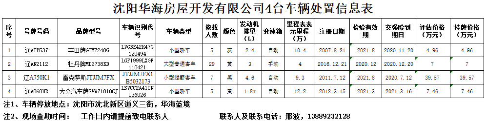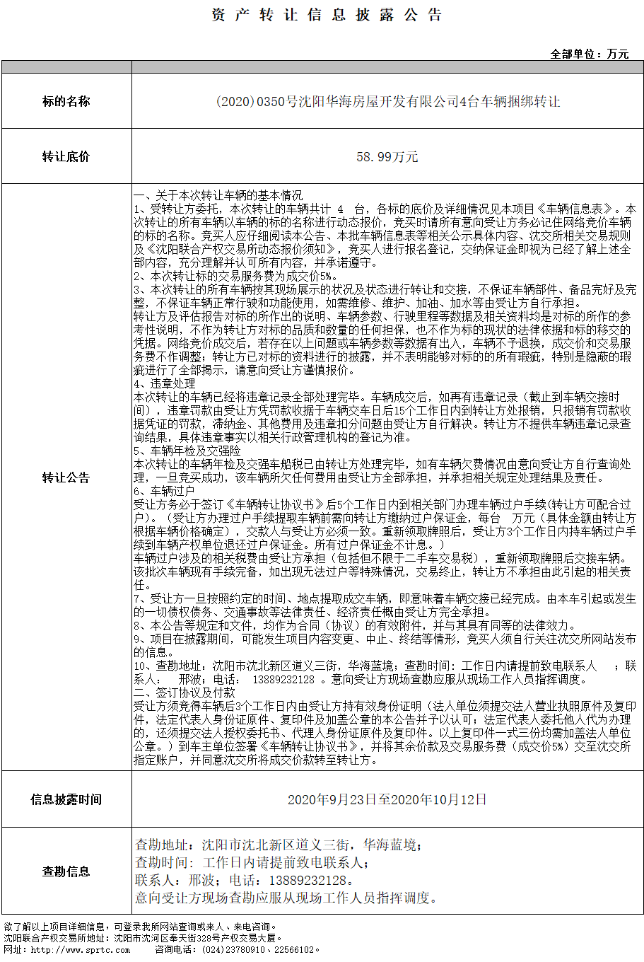 (2020)0350號沈陽華海房屋開發(fā)有限公司4臺車輛捆綁轉(zhuǎn)讓