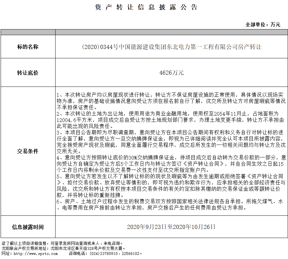 中國能源建設(shè)集團(tuán)東北電力第一工程有限公司房產(chǎn)轉(zhuǎn)讓