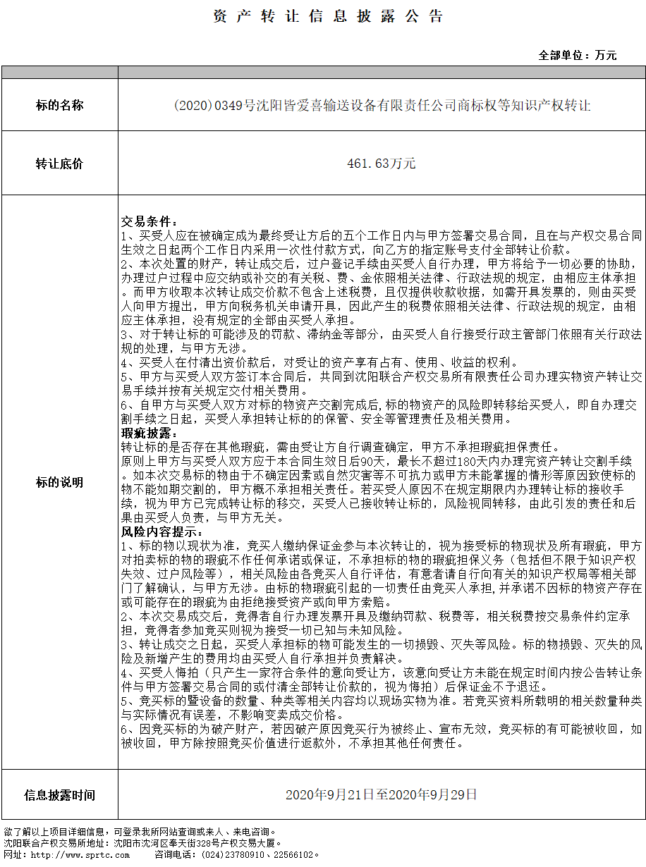 沈陽皆愛喜輸送設(shè)備有限責(zé)任公司商標(biāo)權(quán)等知識產(chǎn)權(quán)轉(zhuǎn)讓NO.6