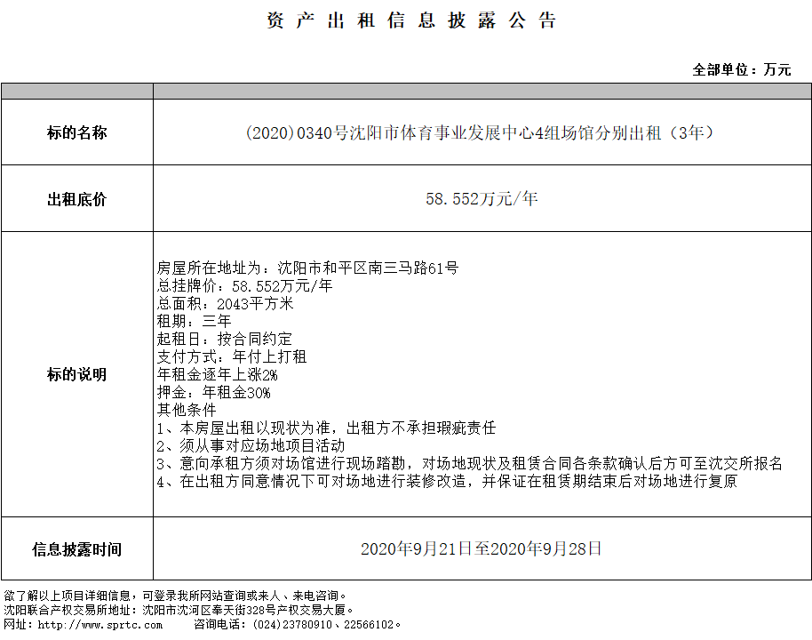 沈陽市體育事業(yè)發(fā)展中心、綜合館出租(租期三年)