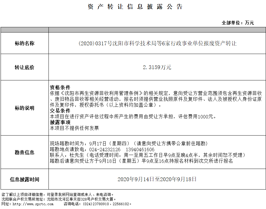 沈陽市科學(xué)技術(shù)局等6家行政事業(yè)單位報廢資產(chǎn)轉(zhuǎn)讓