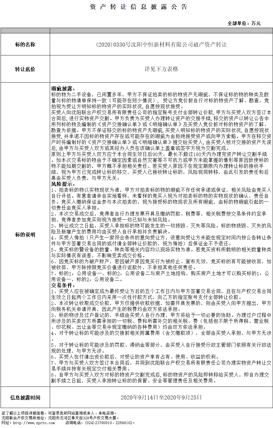 沈陽中恒新材料有限公司公用設備二 第五次掛牌