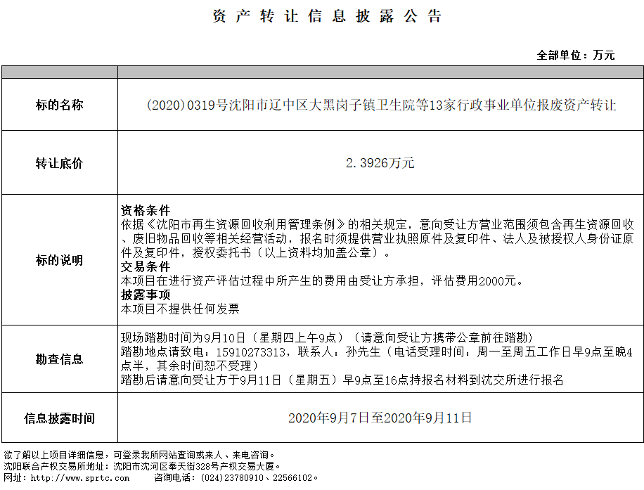 沈陽(yáng)市遼中區(qū)大黑崗子鎮(zhèn)衛(wèi)生院等13家行政事業(yè)單位報(bào)廢資產(chǎn)轉(zhuǎn)讓