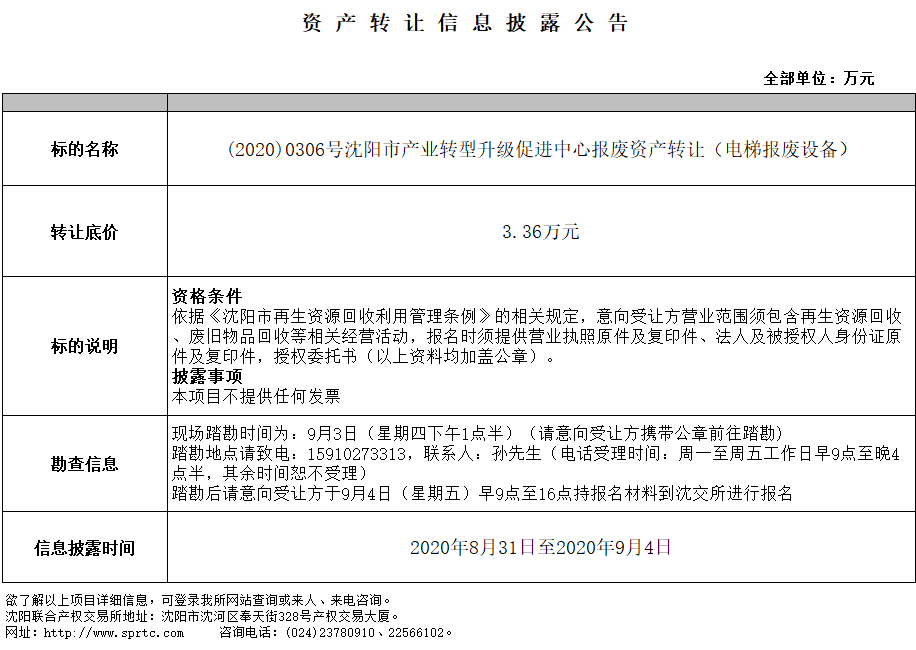 沈陽市產(chǎn)業(yè)轉(zhuǎn)型升級促進(jìn)中心報廢資產(chǎn)轉(zhuǎn)讓