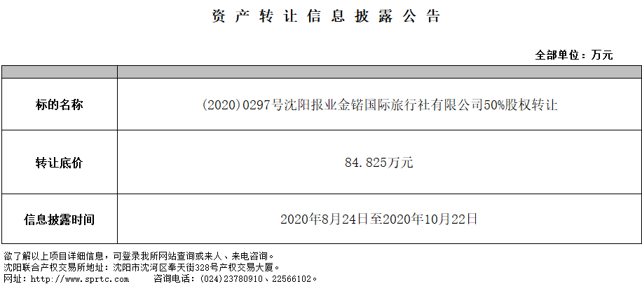 沈陽報(bào)業(yè)金锘國際旅行社有限公司50%股權(quán)轉(zhuǎn)讓