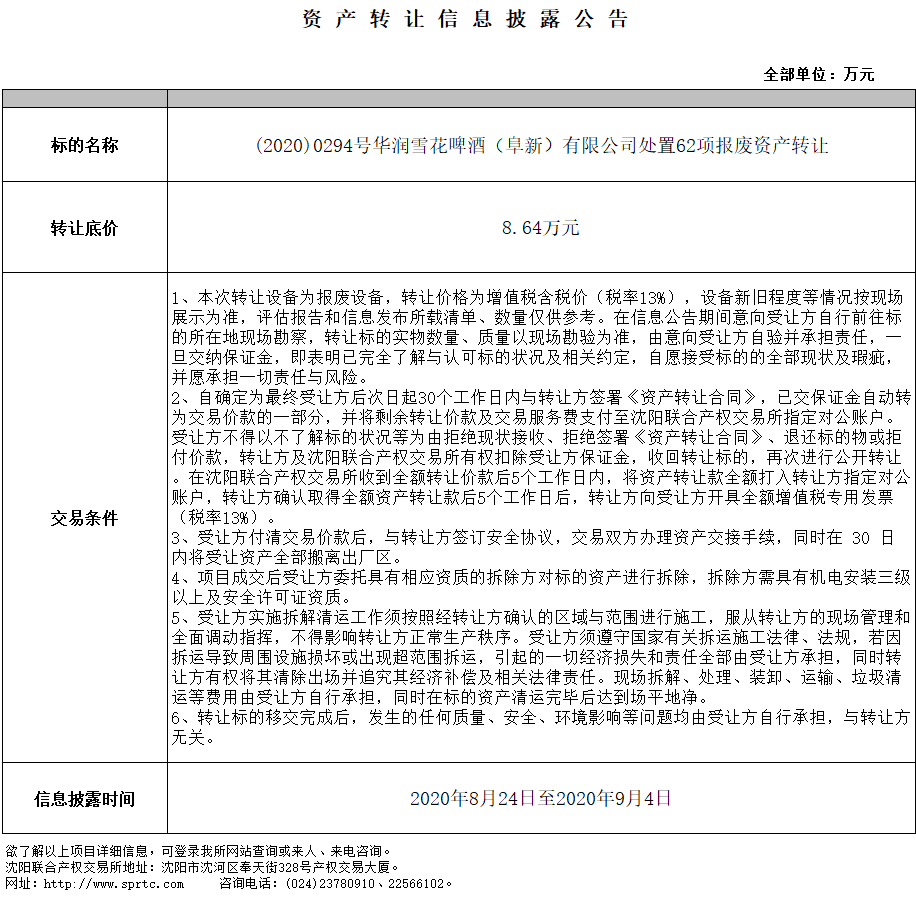 華潤雪花啤酒(阜新)有限公司62項(xiàng)報(bào)廢資產(chǎn)轉(zhuǎn)讓