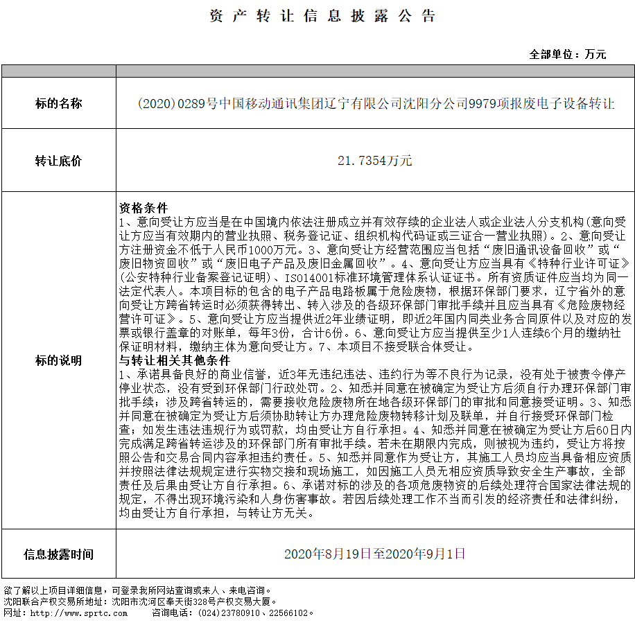 中國移動通訊集團遼寧有限公司沈陽分公司9979項報廢電子設(shè)備轉(zhuǎn)讓