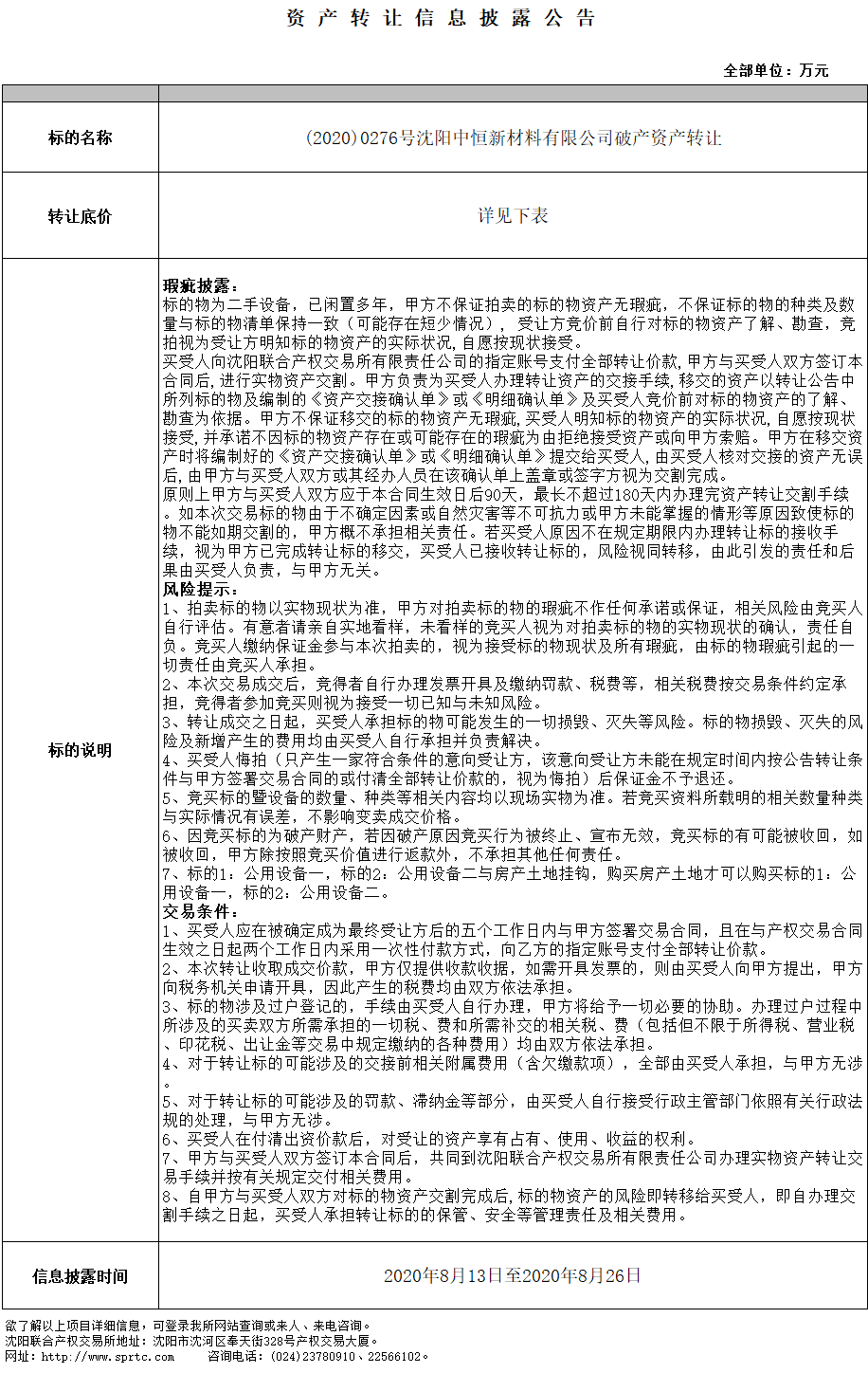 沈陽中恒新材料有限公司二手設(shè)備包 公用設(shè)備一 三次掛牌