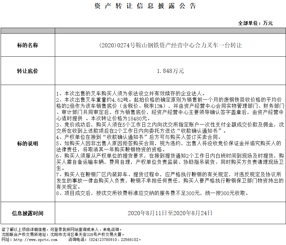 鞍山鋼鐵集團有限公司資產(chǎn)經(jīng)營中心合力叉車一臺