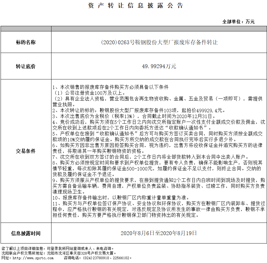 鞍鋼股份大型廠報(bào)廢庫存?zhèn)浼D(zhuǎn)讓