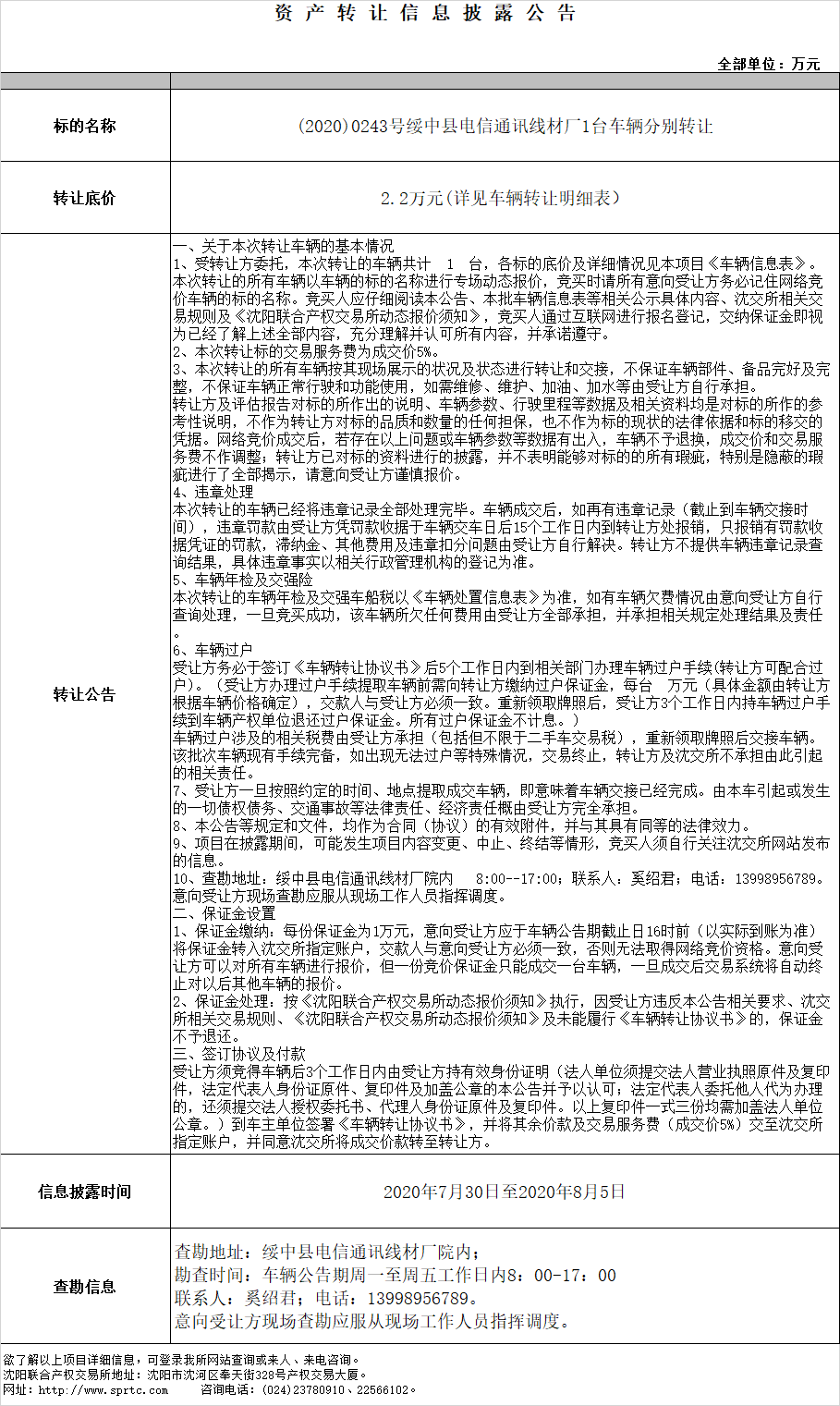 (2020)0243號(hào)綏中縣電信通訊線材廠1臺(tái)車輛分別轉(zhuǎn)讓