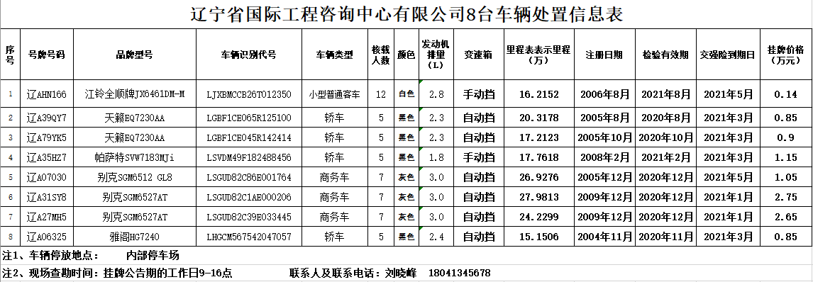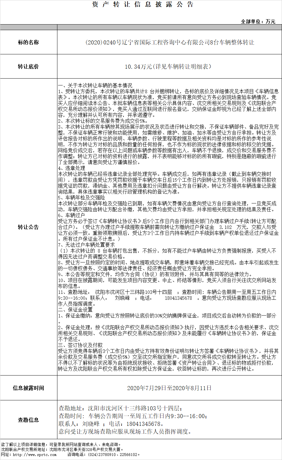 (2020)0240號遼寧省國際工程咨詢中心有限公司8臺車輛整體轉(zhuǎn)讓