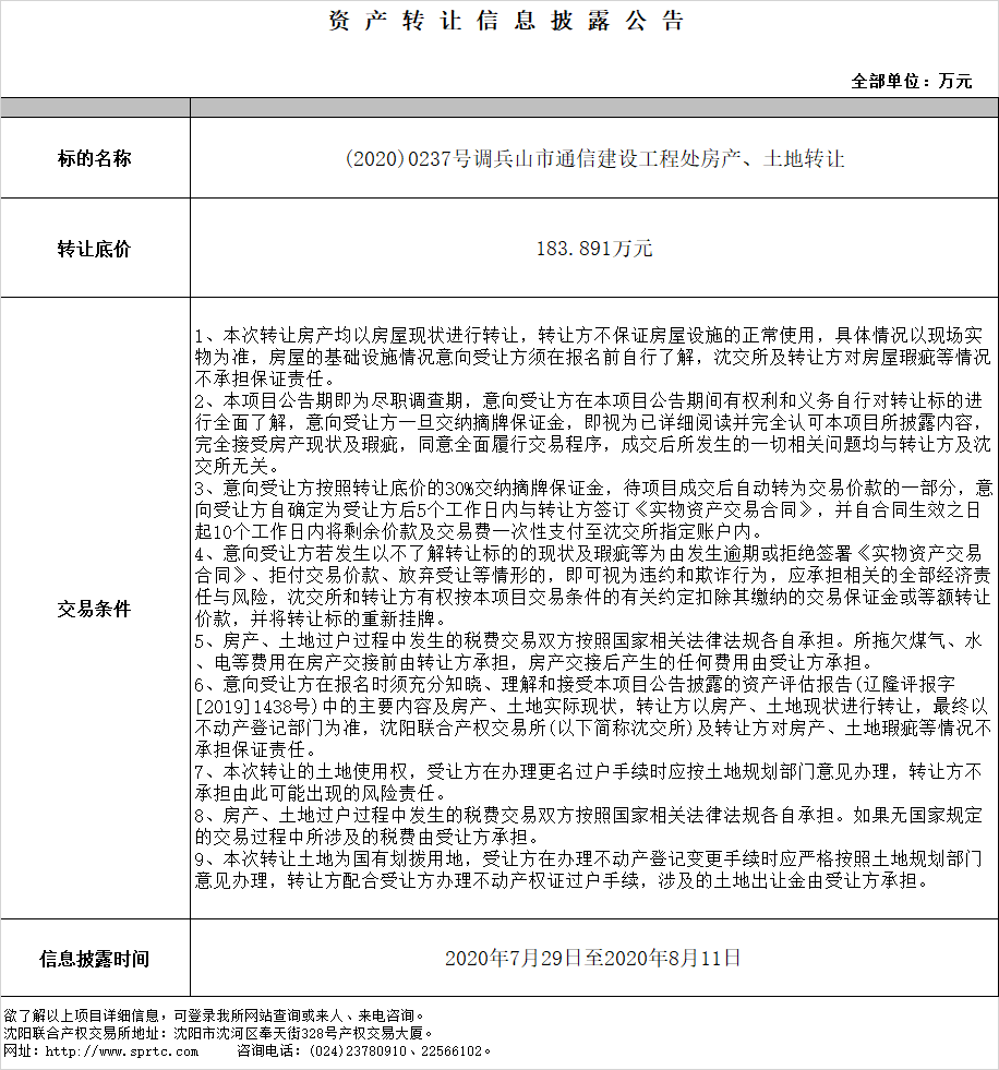 (2020)0237號調兵山市通信建設工程處房產、土地轉讓