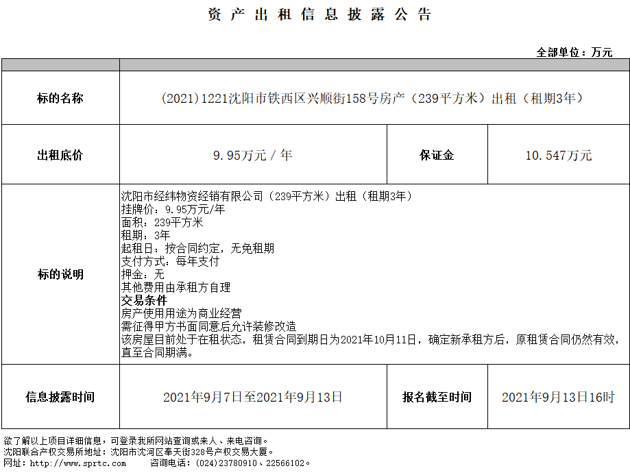 沈陽市鐵西區(qū)興順街158號房產(chǎn)(239平方米)出租(租期3年)