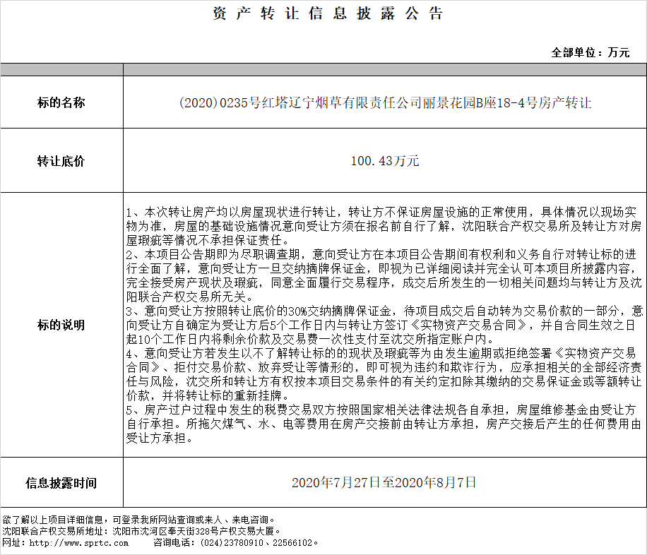 紅塔遼寧煙草有限責(zé)任公司麗景花園B座18-4號(hào)房產(chǎn)轉(zhuǎn)讓