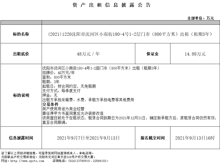 沈陽市沈河區(qū)小南街180-4號1-2層門市(800平方米)出租(租期3年)