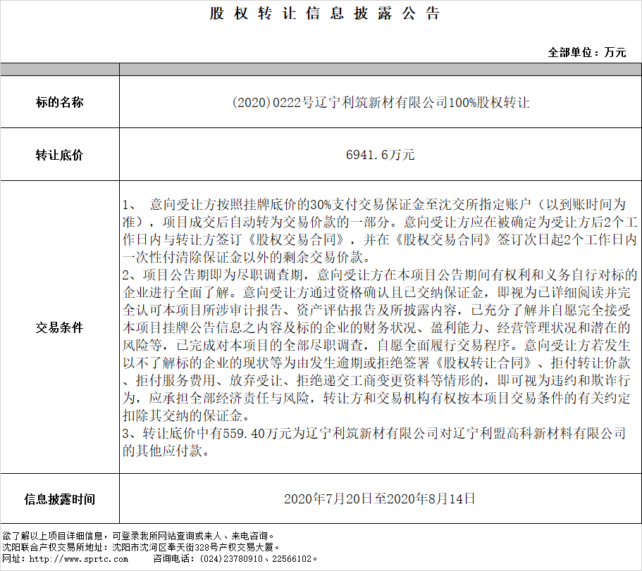 (2020)0222號(hào)遼寧利筑新材有限公司100%股權(quán)轉(zhuǎn)讓