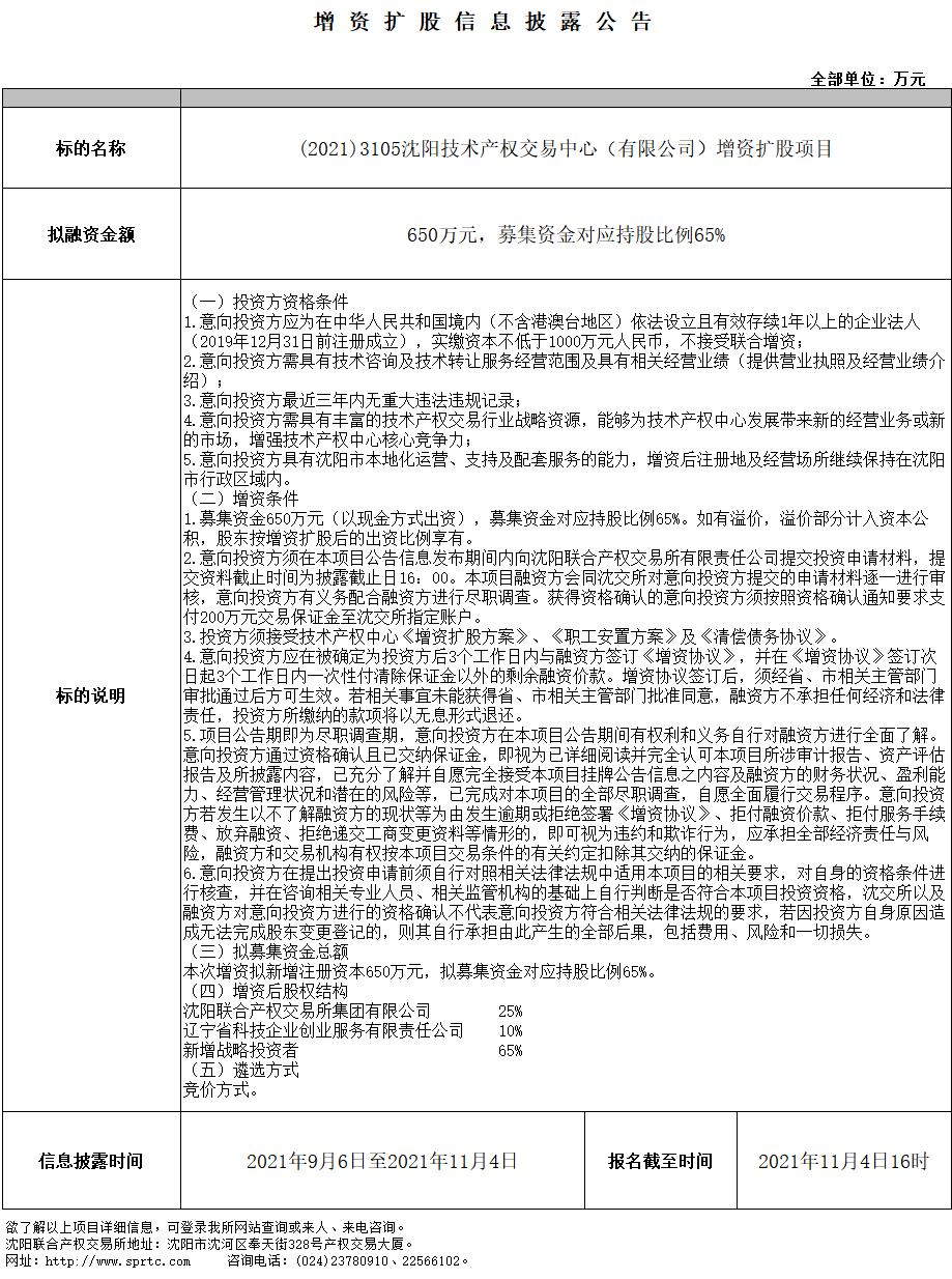 沈陽技術(shù)產(chǎn)權(quán)交易中心(有限公司)增資擴(kuò)股