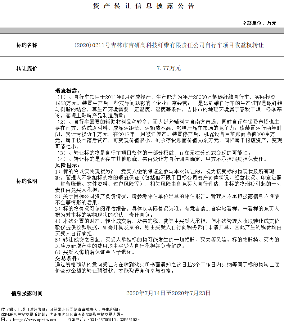 吉研高科技纖維有限責(zé)任公司23.34% 自行車項(xiàng)目收益權(quán)轉(zhuǎn)讓