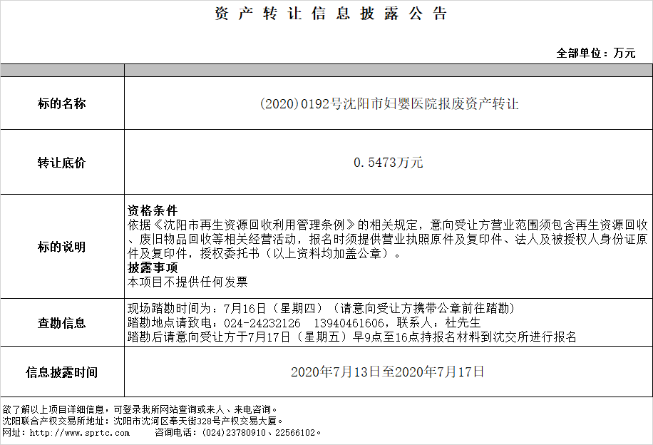 沈陽市婦嬰醫(yī)院報(bào)廢資產(chǎn)轉(zhuǎn)讓