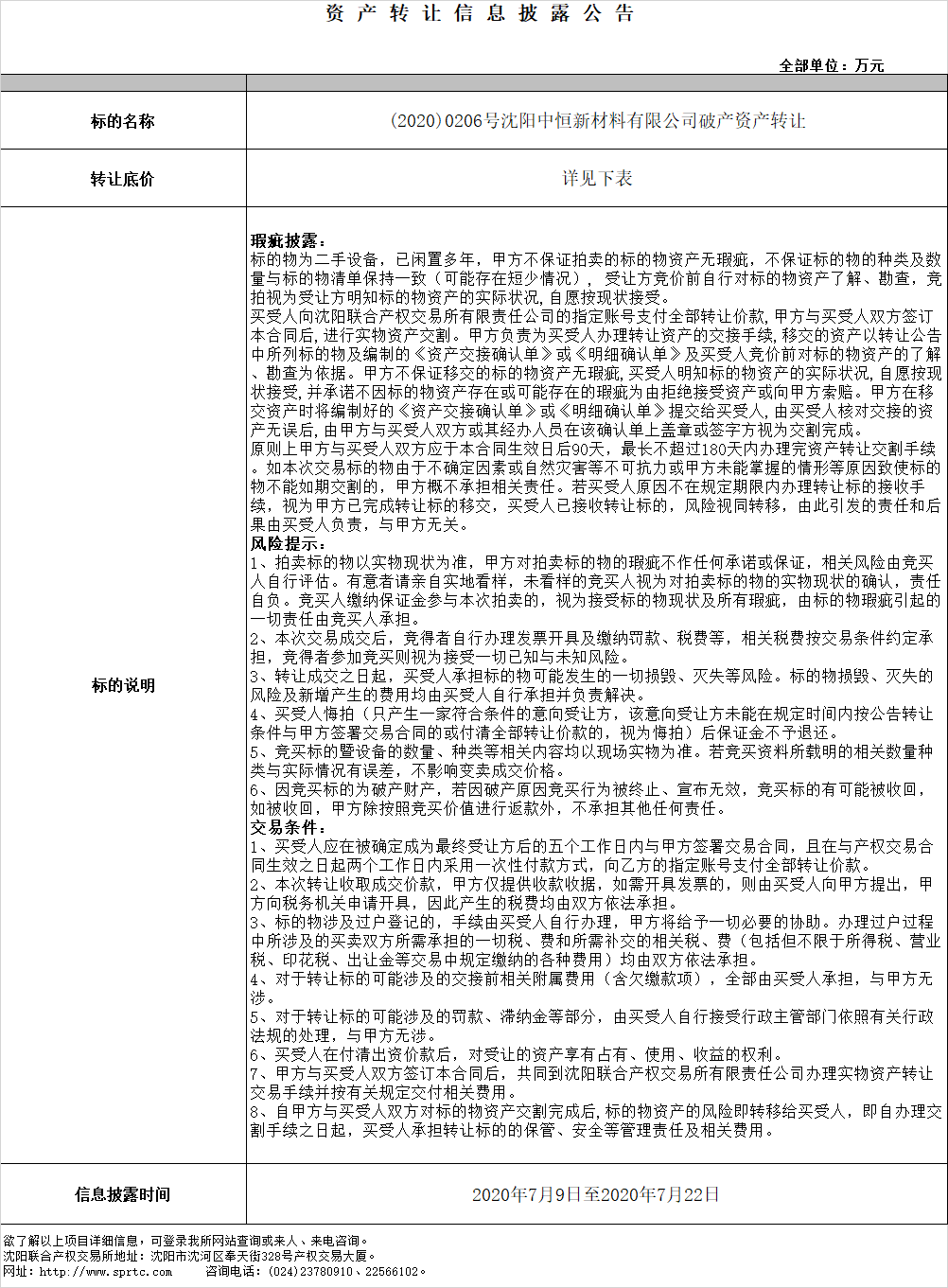 (2020)0206號沈陽中恒新材料有限公司破產(chǎn)資產(chǎn)轉(zhuǎn)讓
