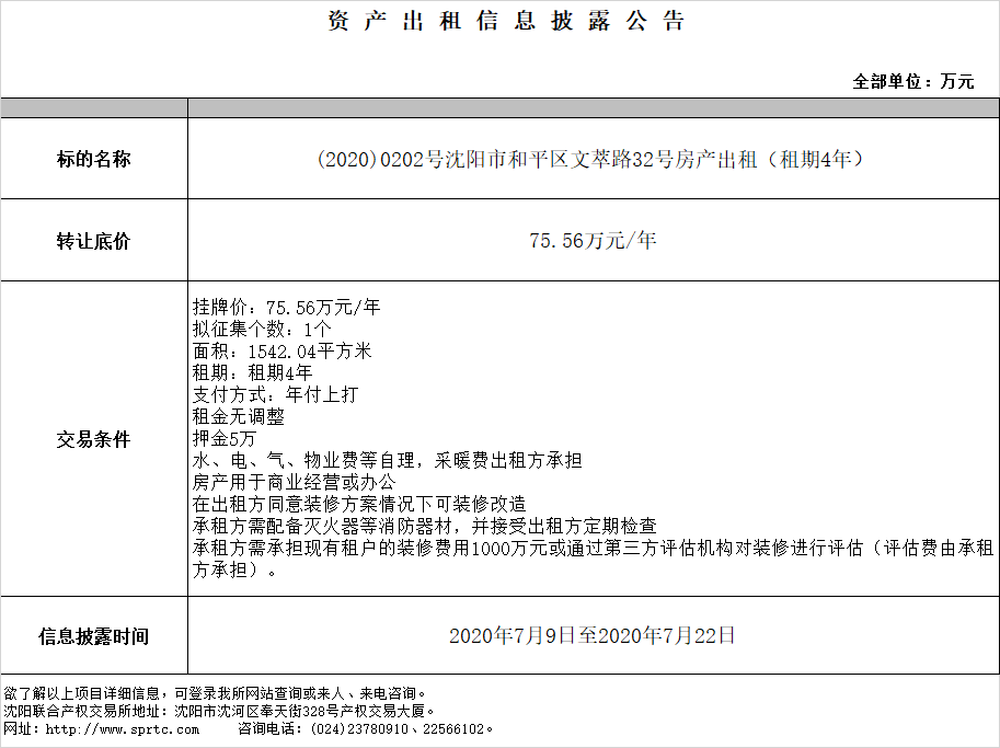 沈陽市和平區(qū)文萃路32號房產出租 (租期4年)。
